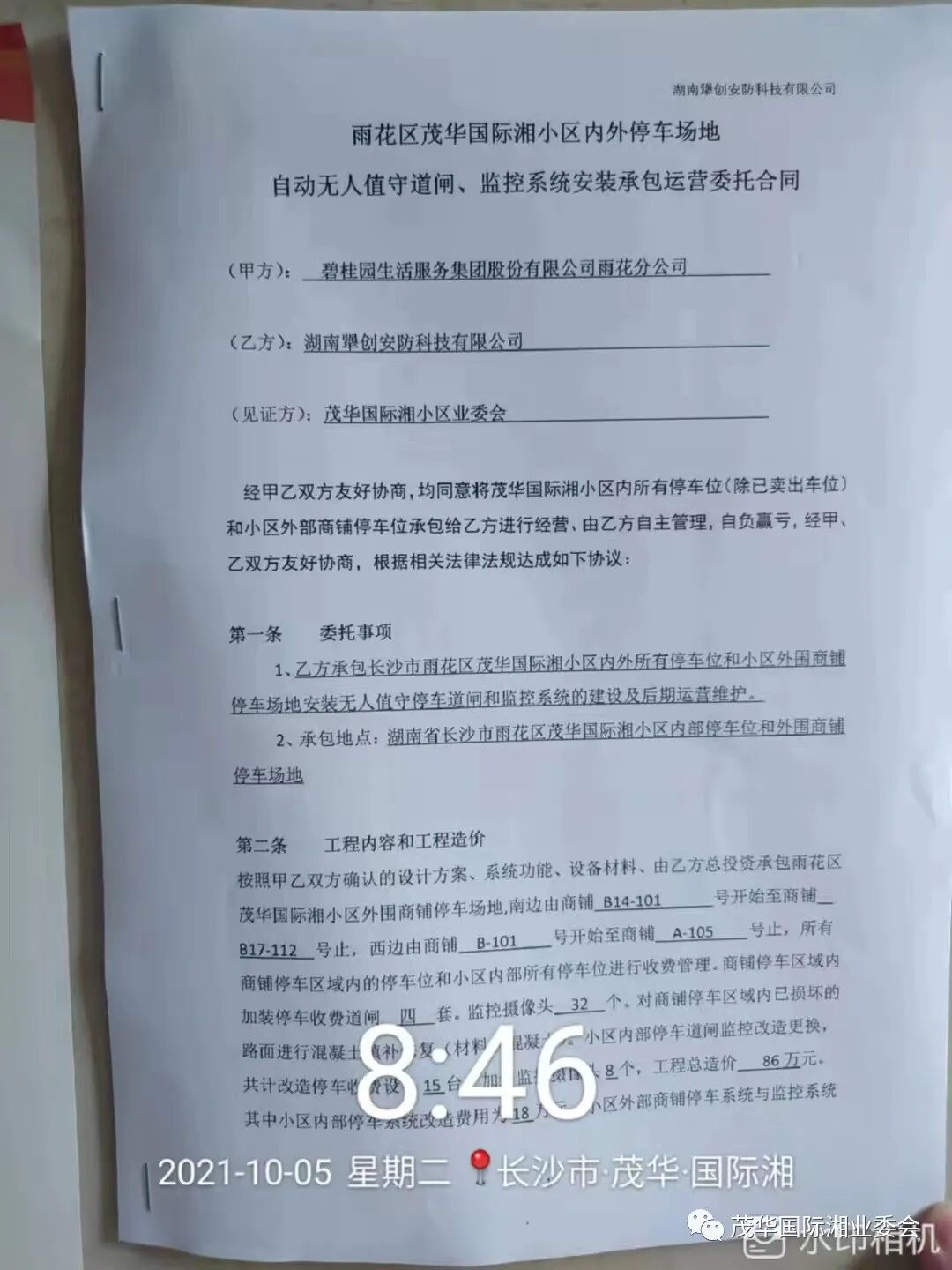 按照甲乙双方确认的设计方案、系统功能、设备材料、由乙方总投资承包雨花区茂华国际湘小区外围商铺停车场地,南边由商铺 B14-101 号开始至商铺 B17-112 号止,西边由商铺 B-101 号开始至商铺 A-105 号止,所有商铺停车区域内的停车位和小区内部所有停车位进行收费管理。商铺停车区域内加装停车收费道闸 四 套。监控摄像头 32 个。对商铺停车区域内已损坏的路面进行混凝土填补修复(材料:混凝土)。小区内部停车道闸监控改造更换,共计改造停车收费设备 15 台,加装监控摄像头 8 个,工程总造价86万 元。其中小区内部停车系统改造费用为 18 万元,小区外部商铺停车系统与监控系统和路面修补等改造费用为 68 万元。